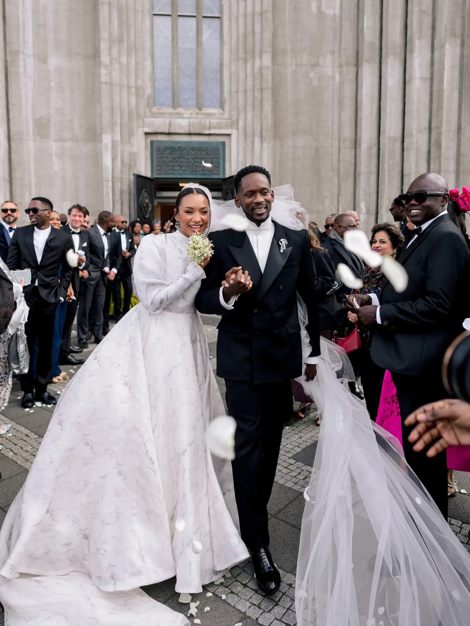 The third wedding was cinematic: vows in August at Hallgrímskirkja, Reykjavík’s iconic cathedral of sweeping concrete columns. Temi walked the aisle in a custom Fendi Haute Couture gown, architectural, timeless, sculptural against the stark Nordic backdrop. Eazi stood dapper in Saint Laurent.