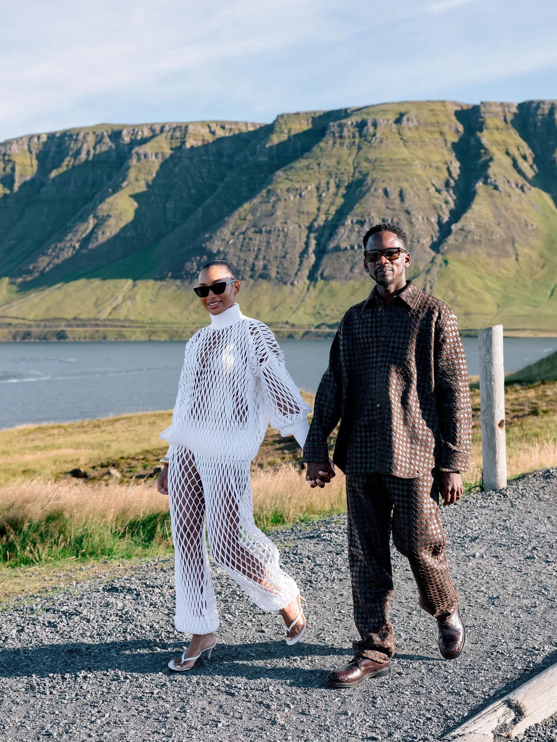 Temi later changed into a sparkling House of Gilles gown with Jimmy Choo heels, and finally a daring Ludovic de Saint Sernin crystal-mesh mini with Larroudé boots for the after-party at The Reykjavík EDITION’s members-only club. Eazi moved fluidly between Alexander McQueen, Wales Bonner, and TOURE Designs, each looking like a study in modern elegance.